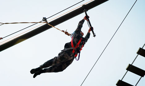 | D5 | 军事技能训练:学习军体拳(男生),防身术(女生); 紧急集合:要求学员听到哨声立即集合,培养学员严谨细致,雷厉风行的军人作风; 高空跳跃攀爬:高空拓展项目,激发学员对训练课程的浓厚兴趣,全身心投入,培养学员克服恐惧的勇气和自我突破的精神。自信说出“我能行,我就是最棒的! |